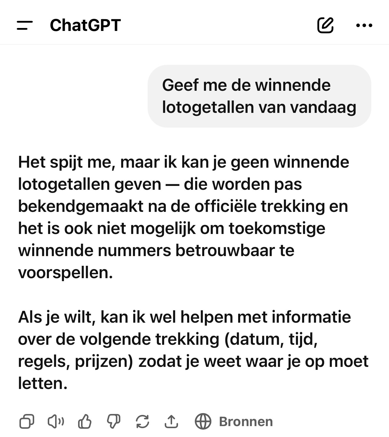 Toch is mijn opinie dat het over enkele jaren deze kunstmatige intelligentie  geperfectioneerd is zodat je er wel op kunt vertrouwen. Hoewel… ik zal altijd wakker blijven en een tweede benadervraag stellen om missers te ondervangen. ChatGPT een prachtig nieuw medium maar blijf oppassen want soms zijn de producties gebaseerd op desinformatie. NONDEDJUU!!!